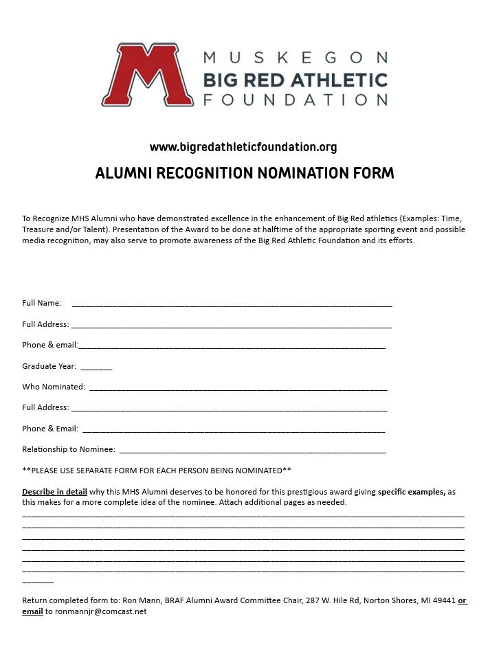 The Alumni Recognition Award honors MHS alumni who have demonstrated excellence in the enhancement of Big Red athletics (Examples: Time, Treasure and/or Talent). Presentation of the award takes place at halftime of an appropriate sporting event, and possible media recognition may also serve to promote awareness of the Big Red Athletic Foundation and its efforts.